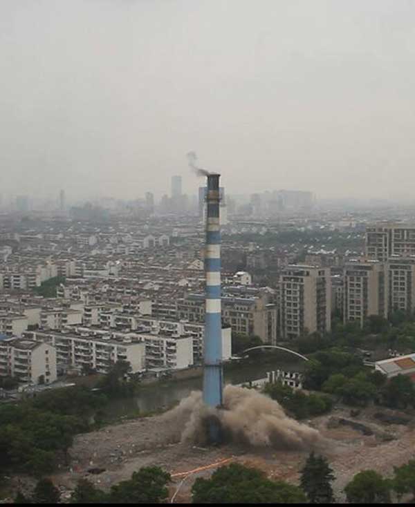 蘇州市地標(biāo)建筑之一,矗立在蘇州城南的蘇州熱電廠大煙囪,該煙囪高80m,周圍有小區(qū)、學(xué)校、高架橋、小商品市場,爆破環(huán)境復(fù)雜。我公司技術(shù)人員仔細(xì)勘察現(xiàn)場后,編制詳細(xì)的爆破方案。最終于2016年8月26日下午3點(diǎn)整實(shí)施爆破拆除,伴隨蘇州人33年的電熱廠大煙囪從此成為歷史。