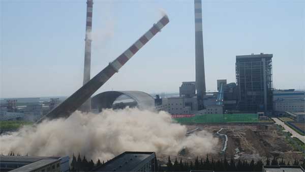 2017年5月18日14時(shí)28分,連云港明達(dá)工程爆破有限公司成功拆除了射陽港發(fā)電有限公司內(nèi)的兩座煙囪。煙囪按設(shè)定方位傾倒,整個(gè)爆破取得圓滿成功,此次爆破為江蘇省內(nèi)完成的首例同時(shí)爆破拆除兩座高達(dá)150m的混凝土煙囪。